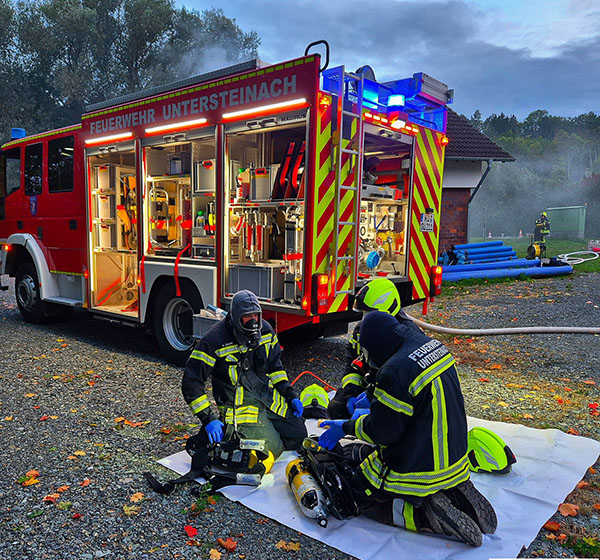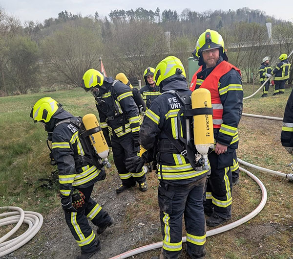 Mehrere Atemschutztrupps waren im Einsatz, um den simulierten Brand zu bekämpfen. Die Löschgruppe Gumpersdorf hat mit ihrer Pumpe Wasser aus der Steinach angesaugt, um die Wasserversorgung sicherzustellen.