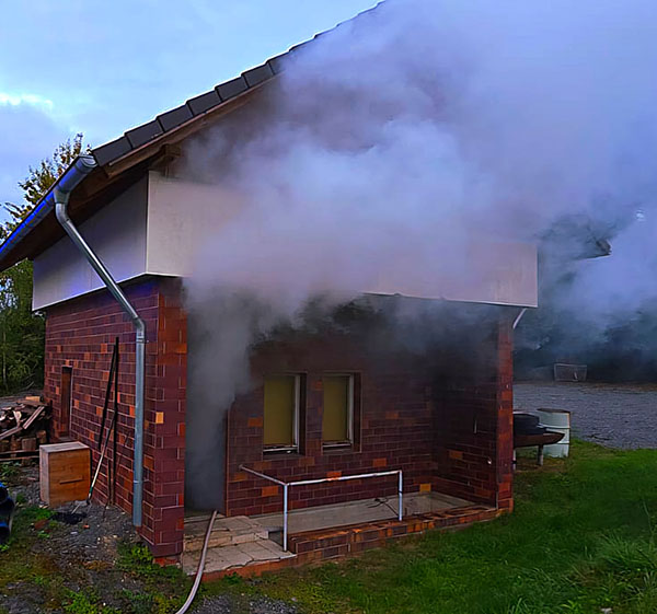 In einem kleinen Werkstattgebäude mit Keller kam es zu einer Verpuffung. Laut der Aussage von Zeugen befinden sich noch zwei Personen in dem Gebäude, welches auch einen Keller besitzt. Außerdem lagern darin gefährliche Stoffe und Gasflaschen.