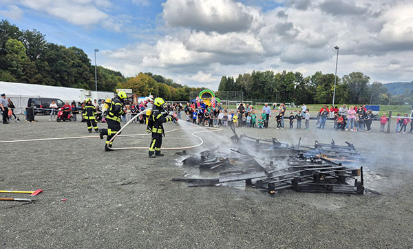 Wir hatten uns vom Landkreis den Feuerlöschtrainer geliehen und es durfte Klein und Groß sich im Umgang mit dem Feuerlöscher probieren. Zudem hatten wir noch unser LF 10/6 mit ausgestellt.