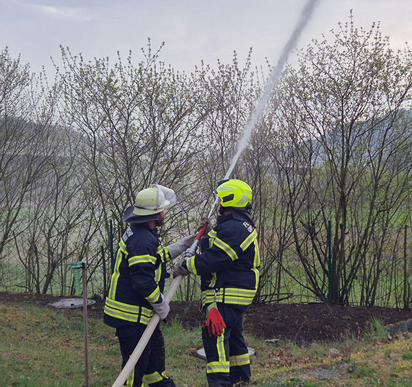 Im weiteren Übungsverlauf wurde ein durch Funkenflug verursachter Brandüberschlag auf die benachbarten Bäume angenommen, welche ebenfalls abgelöscht werden mussten.