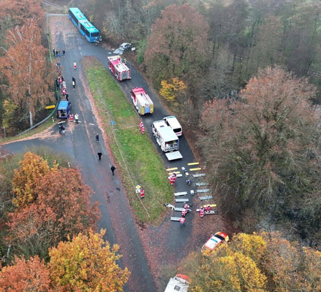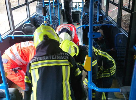 Vor Ort stellte sich die Lage jedoch deutlich schlimmer dar als vermutet und es bot sich den Kräften folgendes Bild: Ein Bus mit ca. 30 Personen kollidierte mit einem PKW. Durch den Aufprall wurde eine Person aus dem PKW geschleudert, eine andere im PKW eingeschlossen. Die Insassen des Busses waren teils schwer verletzt und erstreckten sich über die ganze Einsatzstelle.
