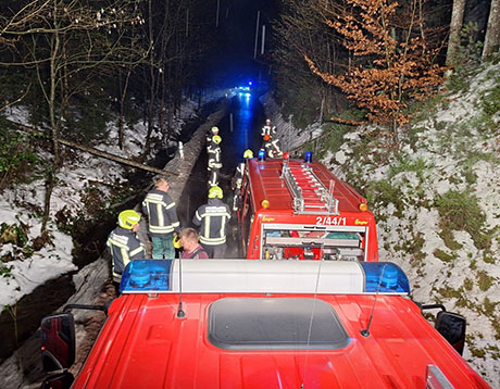 Wir leuchteten die Einsatzstelle aus und beseitigen den Baum mittels Kettensäge.